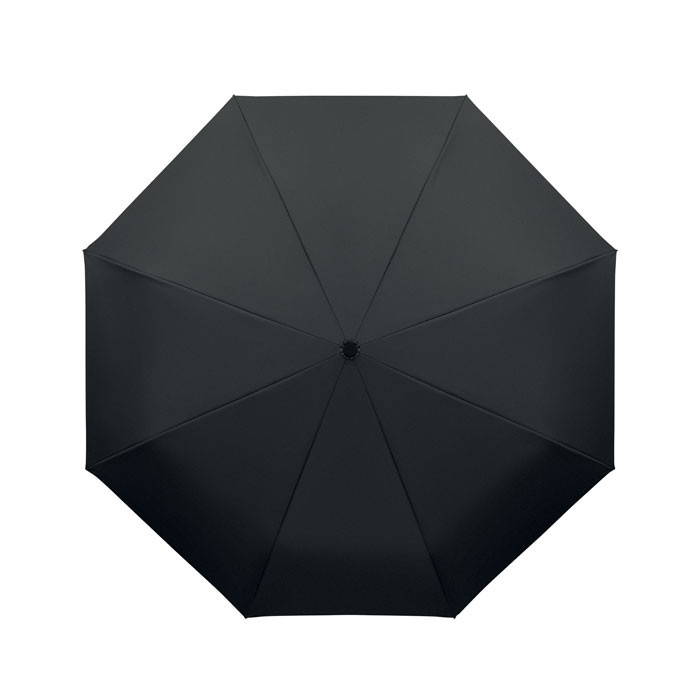 Összecsukható 21'' szélálló esernyő teljes fekete bevonatú üvegszálas vázzal, 2 szekcióval. Üvegszálas bordák. 190T RPET pongyola panelek. D alakú karabineres fogantyú w / gumi kivitelben,. Automatikus nyitás és zárás. Tartalmazza a tasakot