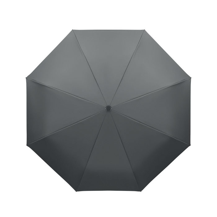 Összecsukható 21'' szélálló esernyő teljes fekete bevonatú üvegszálas vázzal, 2 szekcióval. Üvegszálas bordák. 190T RPET pongyola panelek. D alakú karabineres fogantyú w / gumi kivitelben,. Automatikus nyitás és zárás. Tartalmazza a tasakot
