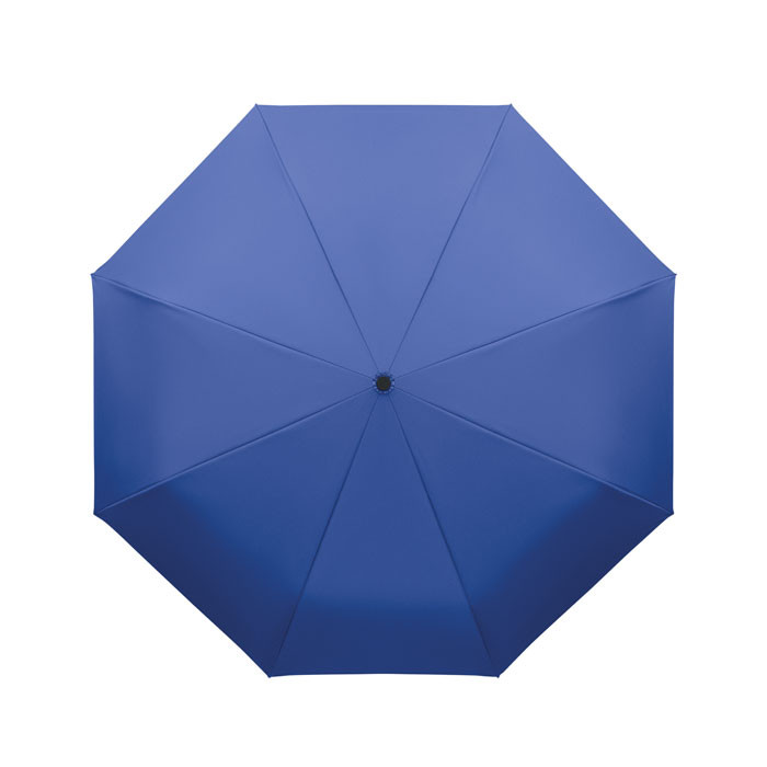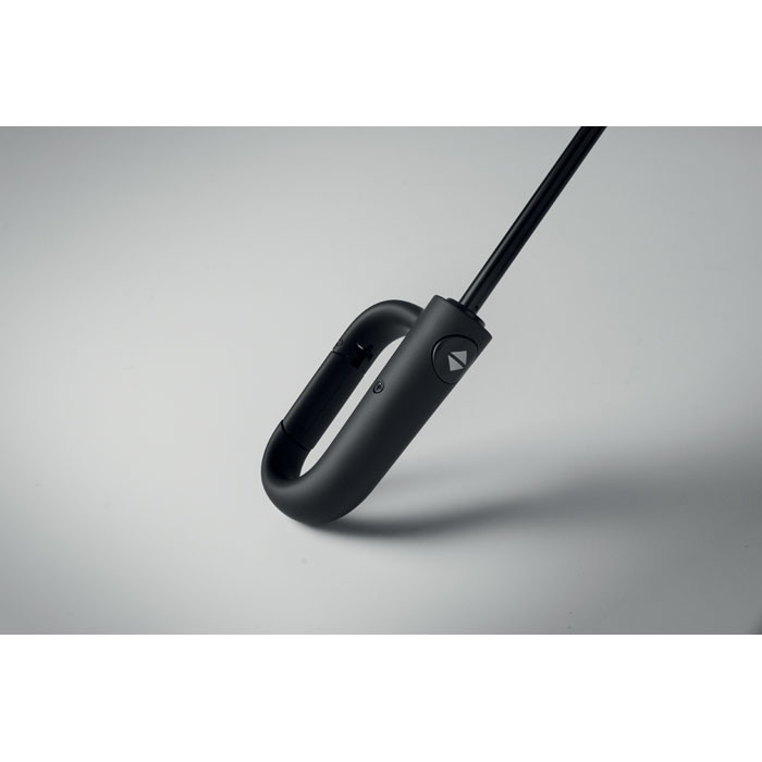 Összecsukható 21'' szélálló esernyő teljes fekete bevonatú üvegszálas vázzal, 2 szekcióval. Üvegszálas bordák. 190T RPET pongyola panelek. D alakú karabineres fogantyú w / gumi kivitelben,. Automatikus nyitás és zárás. Tartalmazza a tasakot