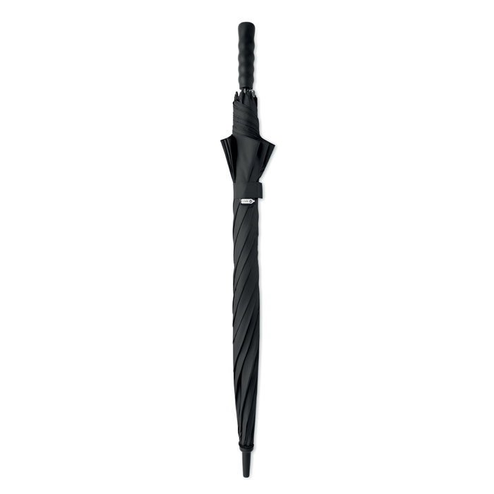 27 colos, automatikus nyitású, szélálló esernyő 190T RPET pongee nyersselyem anyagból. Üvegszálas rúd és bordák. Búzaszalma és Újrahasznosított ABS markolat. Műanyag cikkelyzáró elemek és csúcs.