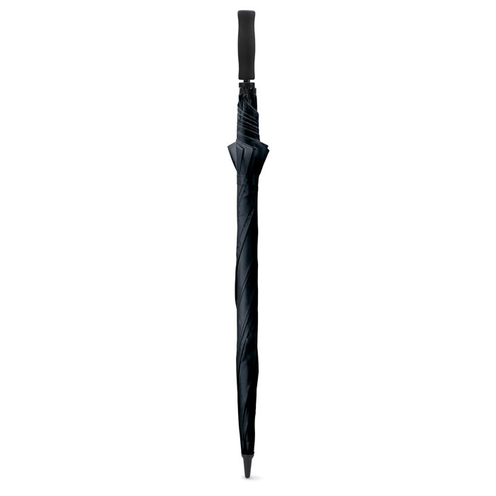 30 colos manuális szélálló esernyő. 190T poliészter anyagból. Üvegszálas nyél és váz. Fekete műanyag csúcsok. Fekete egyenes EVA markolat.