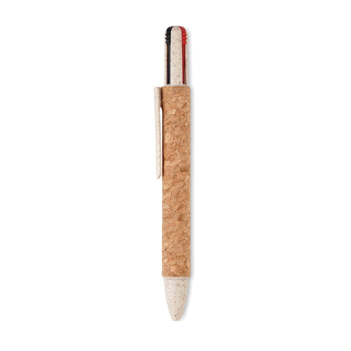 4 színű nyomógombos golyóstoll parafa tolltesttel és búzaszalma (50%) és ABS műanyag (50%) szerelvényekkel. Színek: piros, zöld, kék és fekete.
