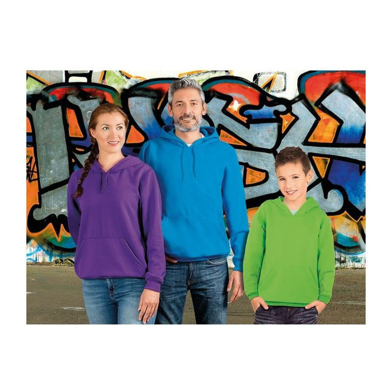 100% poliészter 280 g / m² szálcsiszolt polár szövet belsejében. Dupla anyagú kapucni. Állítható húzózsinór a kapucnin (a gyerekméretek kivételével). Kenguru zseb. Bordázott mandzsetta és derék.