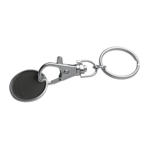 Cseppkarabineres fém kulcstartó, levehető bevásárlókocsi-érmével, 1 oldalon színes borítással.