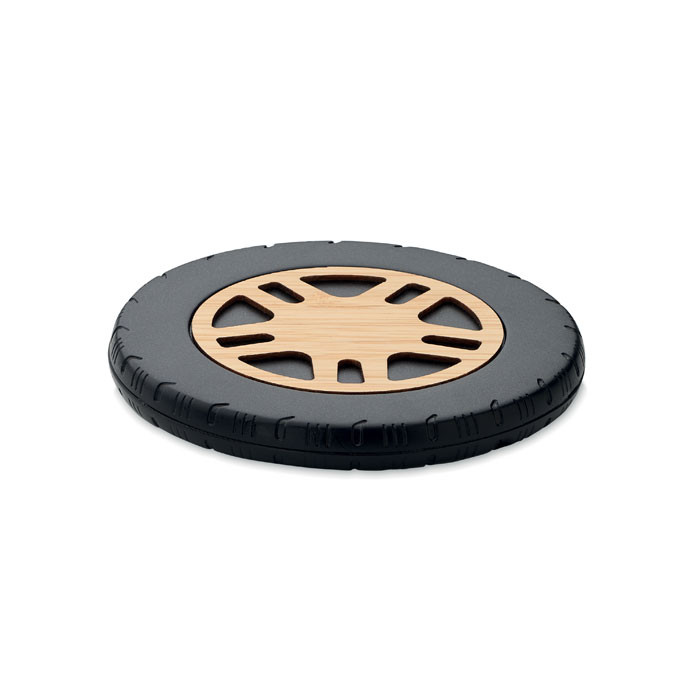 Autókerék alakú, 15W vezeték nélküli töltő újrahasznosított ABS-ből és bambuszból. Csatlakoztassa a számítógéphez, helyezze rá az okostelefont, és hagyja, hogy feltöltse. Teljesítmény: DC 9V/1,10A (15W) a gyors töltéshez.