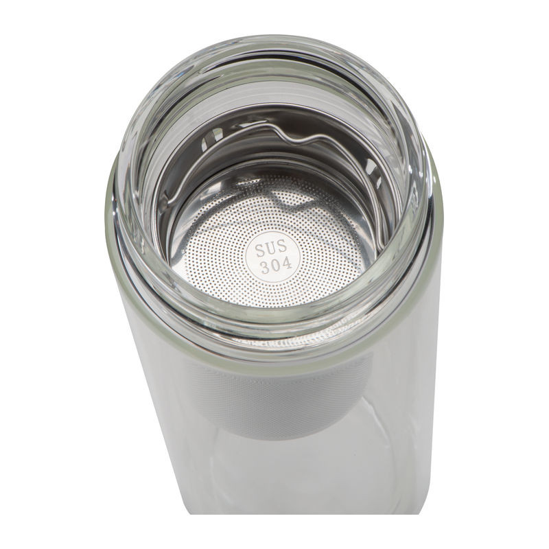 Duplafalú, vákuumszigetelt boroszilikát üveg kulacs bambusz tetővel, kivehető szűrőbetéttel teának vagy gyümölcsöknek, 420 ml űrtartalommal, szivárgásmentes. A természetes anyagból következően termékenként szín és mintázat eltérések előfordulhatnak, mely befolyásolhatja az emblémázási képet is.