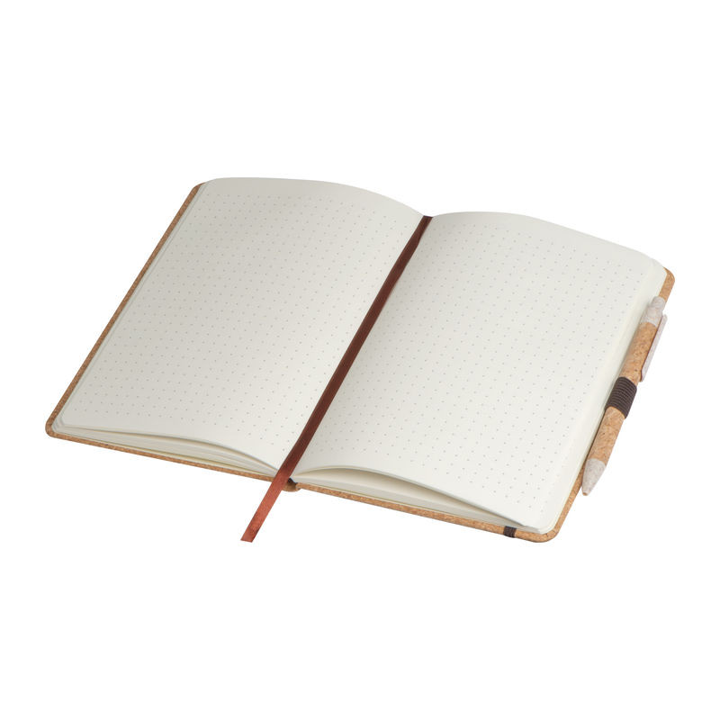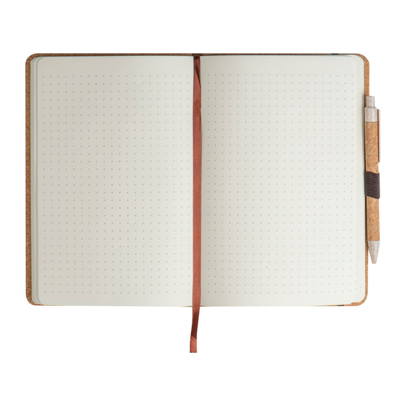 A5 méretű,160 oldalas, pontozott jegyzetfüzet parafa borítóval, gumipánttal, tolltartó hurokkal, parafa és búzaszalma kombinációjú golyóstollal, karton dobozba csomagolva.