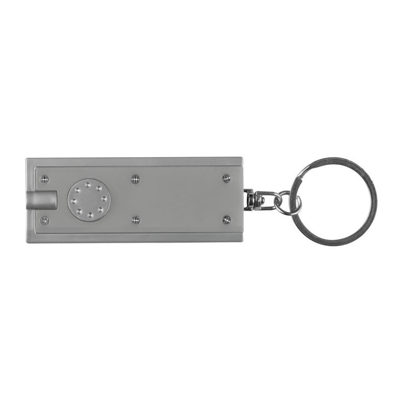 Lapos, téglalap alakú műanyag kulcstartó, LED lámpával, fém kulcskarikával. A termékhez tartozik két darab, a működéséhez szükséges lapos elem.