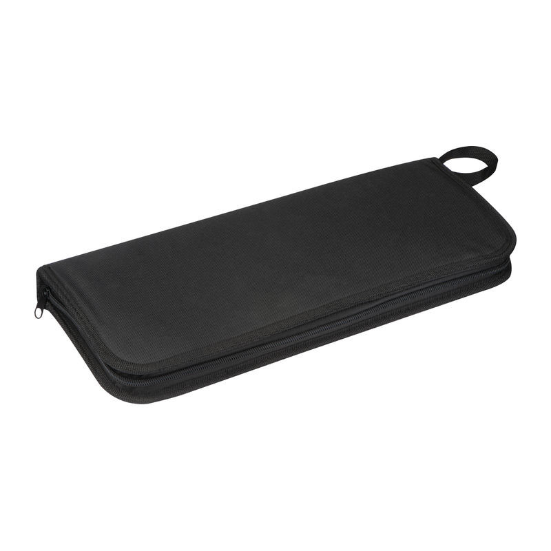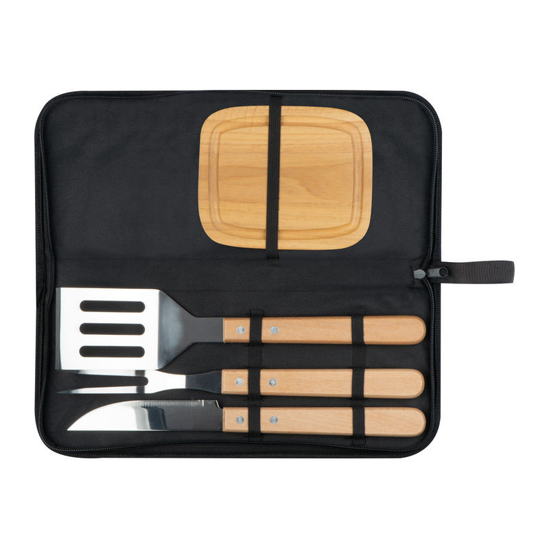 Grillezőkészlet rozsdamentes acélból és tölgyfából, amely vágódeszkából, grillezőből, húsvillából és húskésből áll, 600D poliészter hordozó füllel és táskával.