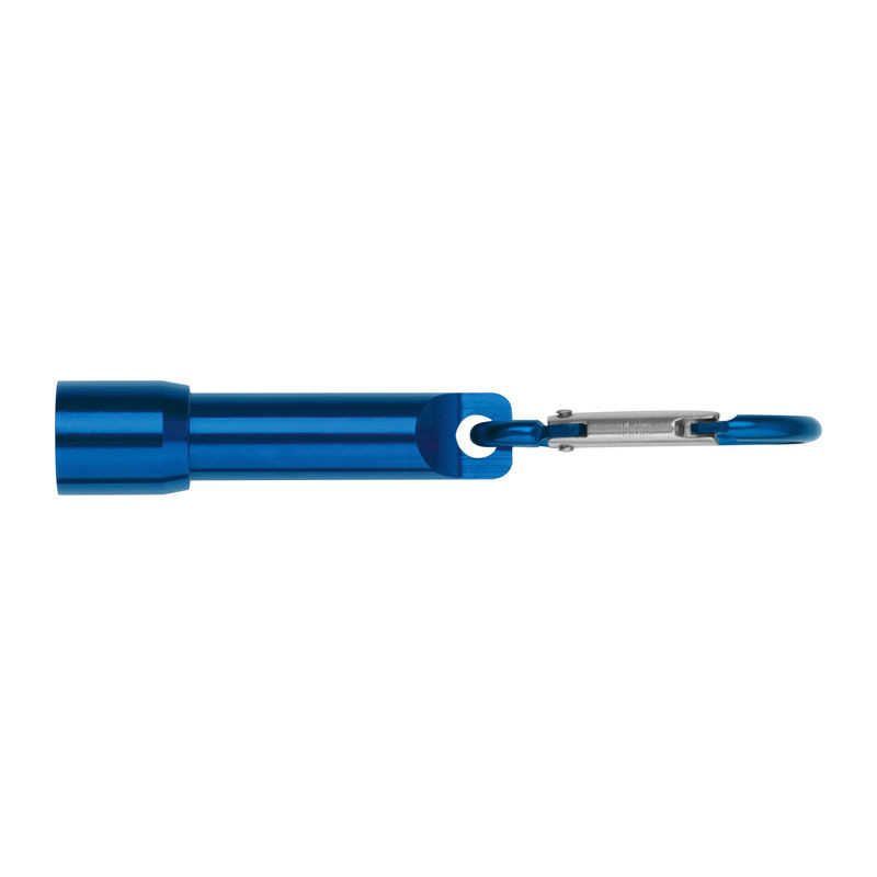 Mini zseblámpa karabinerrel, mely újrahasznosított alumíniumból készült. A csomag 4 gombelemet tartalmaz.
