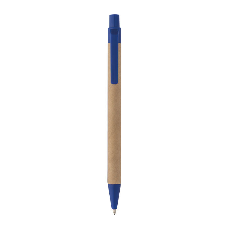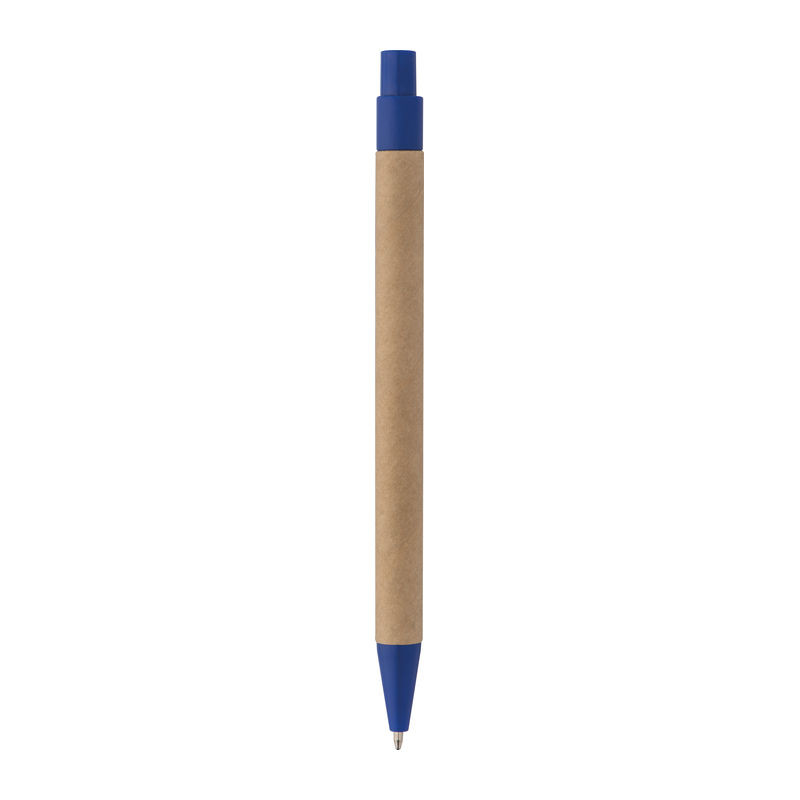 Újrahasznosított kartonból és színes műanyagból (ABS) készült papír golyóstoll, kéken író tollbetéttel.