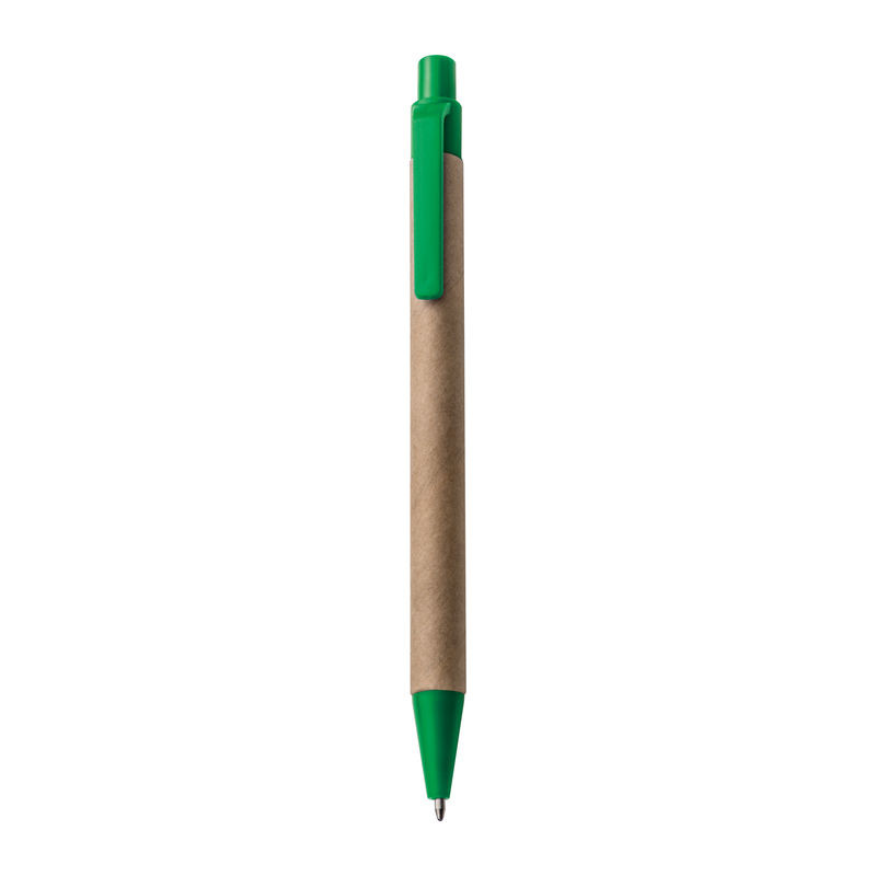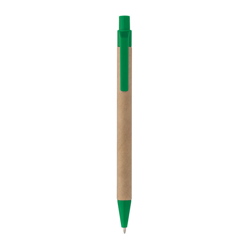 Újrahasznosított kartonból és színes műanyagból (ABS) készült papír golyóstoll, kéken író tollbetéttel.
