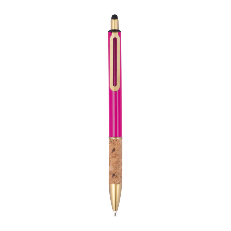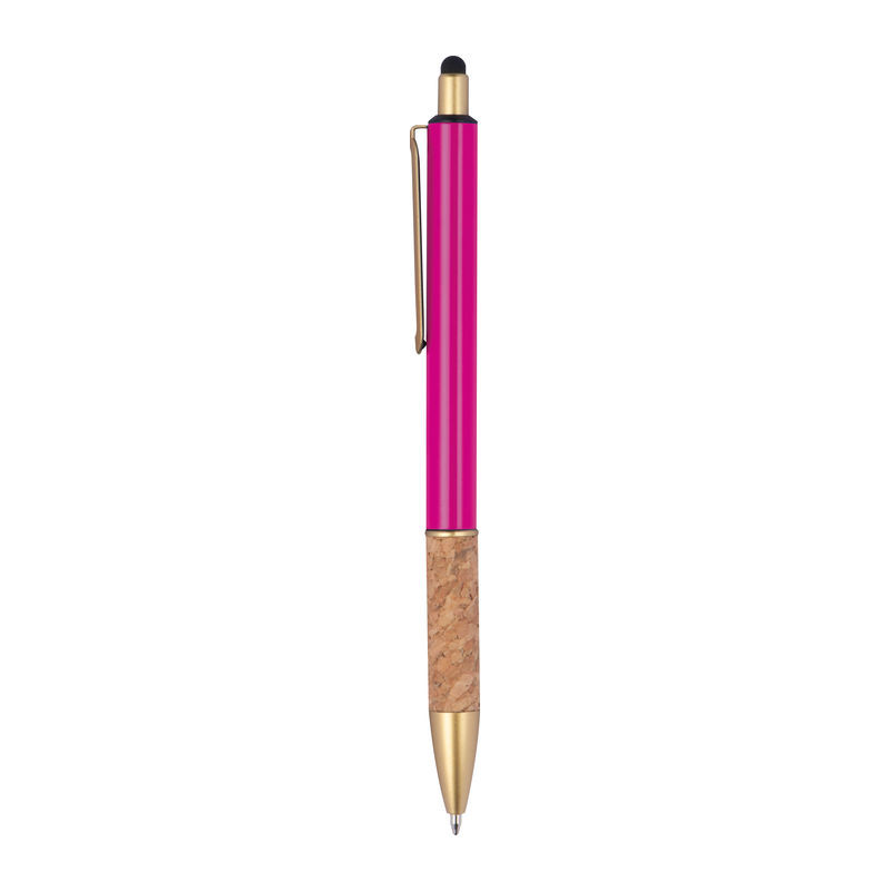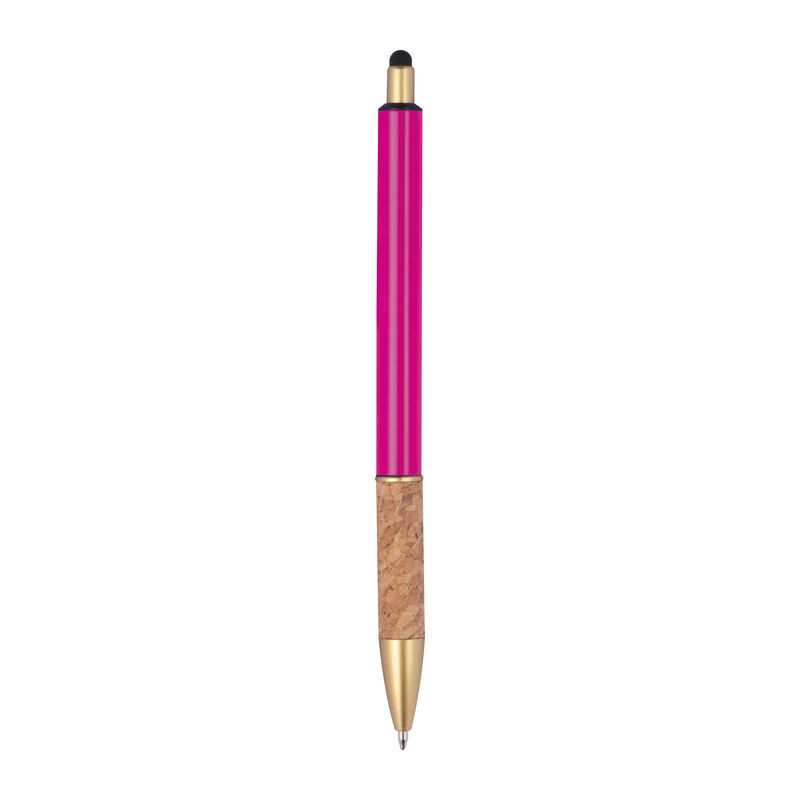 Fém golyóstoll aranyszínű kiegészítőkkel, kék tollbetéttel, érintőképernyős funkcióval és parafa fogórésszel.