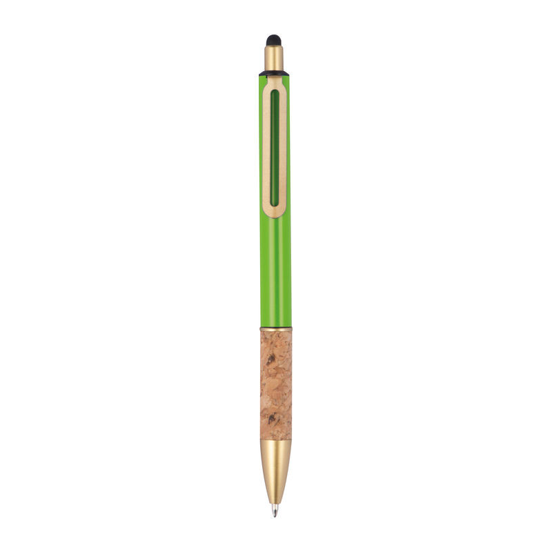 Fém golyóstoll aranyszínű kiegészítőkkel, kék tollbetéttel, érintőképernyős funkcióval és parafa fogórésszel.
