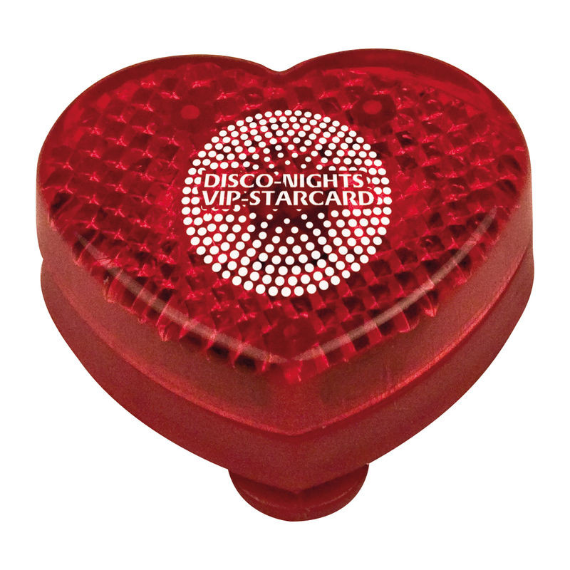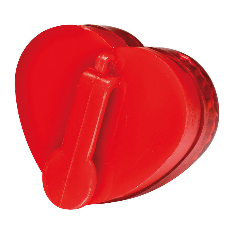 Műanyag, szív formájú LED világítással ellátott jelzőfény. Táskára, ruhára de akár biciklire is akasztható. A termékhez tartozik egy, a működéséhez szükséges laposelem.