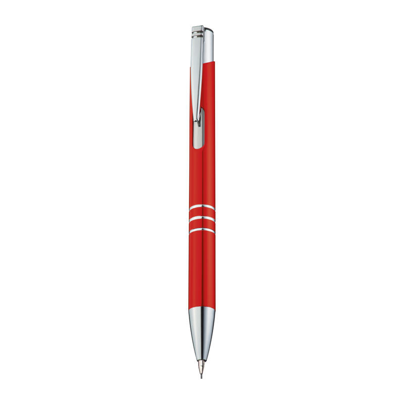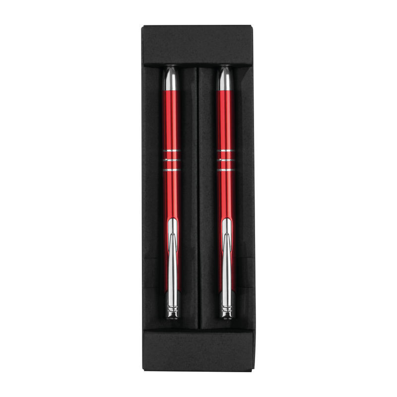 Fém írókészlet, amely egy nagy kapacitású kék tintapatronos golyóstollat és egy mechanikus ceruzát tartalmaz, elegáns kartondobozba csomagolva.