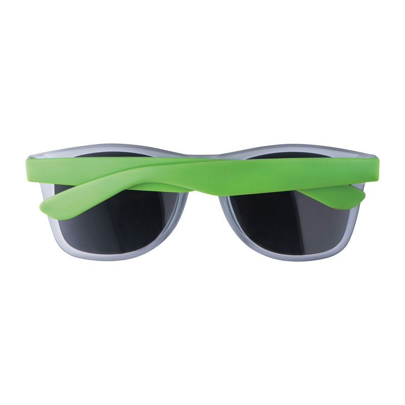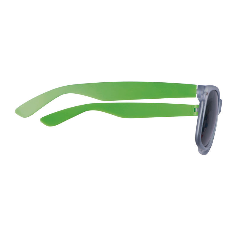 Napszemüveg átlátszó kerettel, színes szárral és UV 400 tanúsítvánnyal rendelkező lencsékkel.