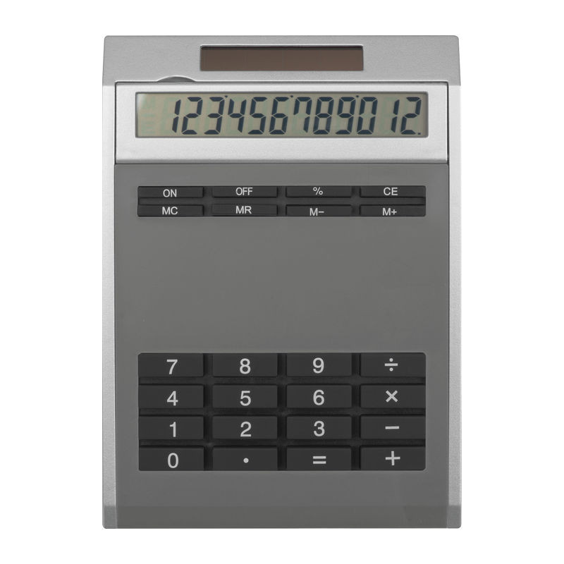 Ezüst színű műanyagból készült dizájn számológép, amely napelemmel és elemmel is működik. 12 számjegyű kijelzővel.