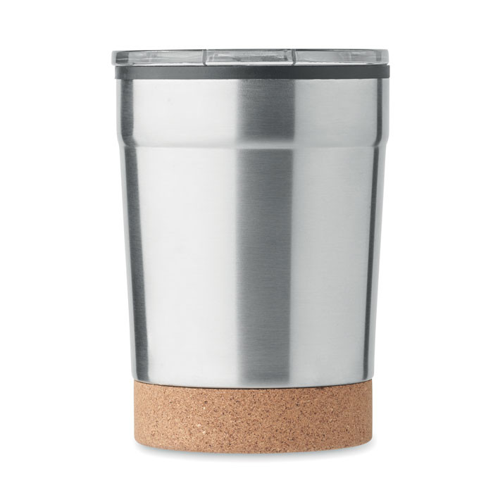 Duplafalú rozsdamentes acél pohár PP belső oldallal, parafa talppal és csúsztatható ivónyílással ellátott fedéllel. Szivárgásmentes. Űrtartalom: 300 ml.