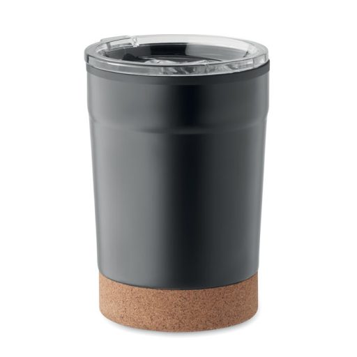 Duplafalú rozsdamentes acél pohár PP belső oldallal, parafa talppal és csúsztatható ivónyílással ellátott fedéllel. Szivárgásmentes. Űrtartalom: 300 ml.