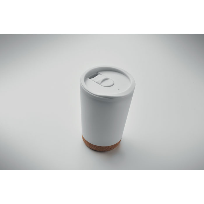 Duplafalú pohár PP-ből, parafa talppal és csúsztatható ivónyílással ellátott, PS-ből készült fedéllel. Űrtartalom: 300 ml.