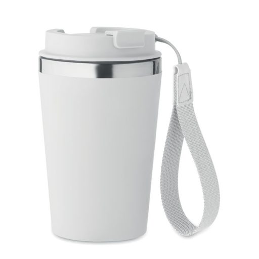 Duplafalú pohár újrahasznosított rozsdamentes acélból (90% újrahasznosított rozsdamentes acél és 10% rozsdamentes acél), PP külső réteggel, RPET csuklópánttal. Űrtartalom: 350 ml.