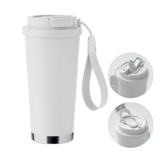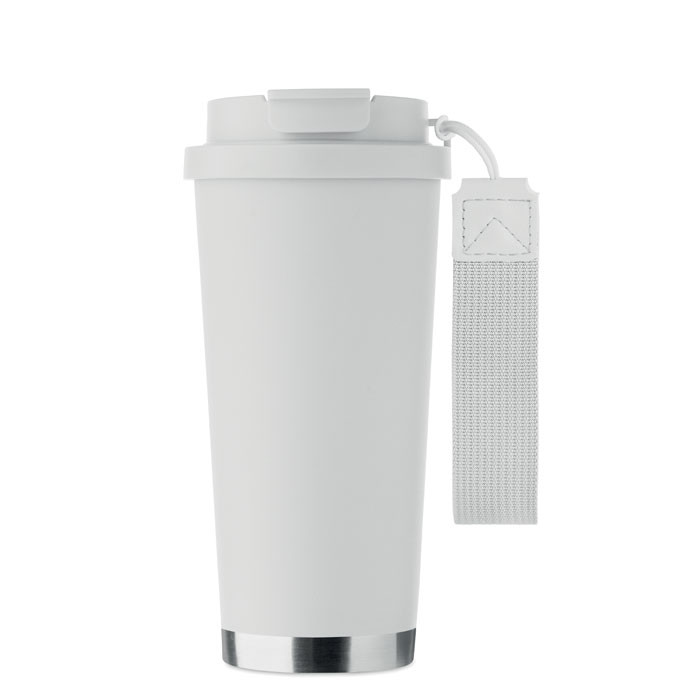 Duplafalú, újrahasznosított rozsdamentes acél (90% újrahasznosított rozsdamentes acél és 10% rozsdamentes acél) pohár, PP fedéllel (2 az 1-ben ivónyílással és szívószálas fedéllel) és RPET hordszíjjal. Szivárgásmentes. Űrtartalom: 500 ml.