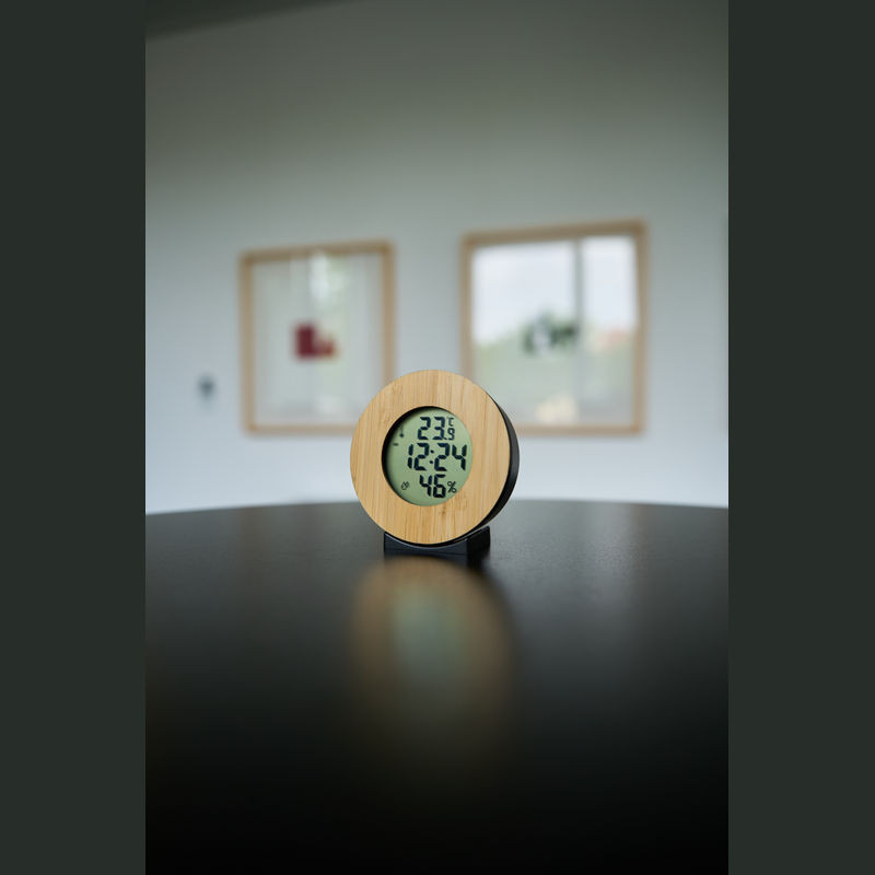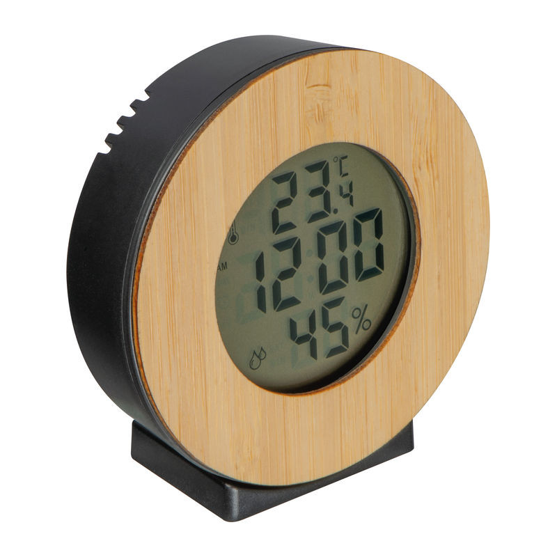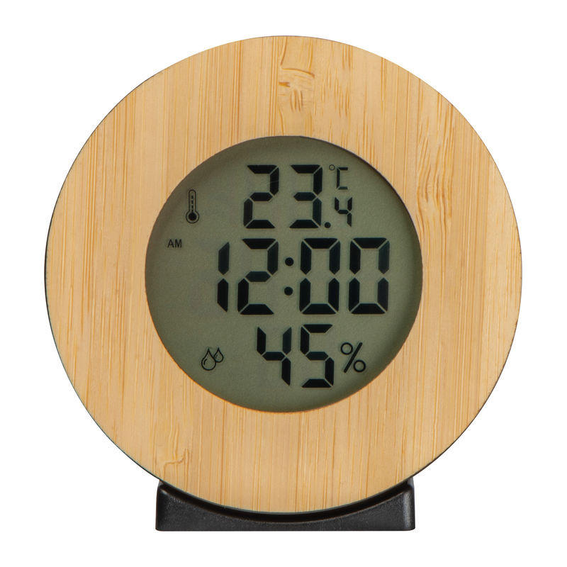 Digitális időjárás-állomás bambusz elemekkel. Az óra (12/24 órás formátum) mellett ébresztőfunkcióval, hőmérővel (°C/°F), páratartalom-mérővel és dátumkijelzővel is rendelkezik. A csomag nem tartalmazza a szükséges AAA elemet, de külön megrendelhető (cikkszám: 999400).