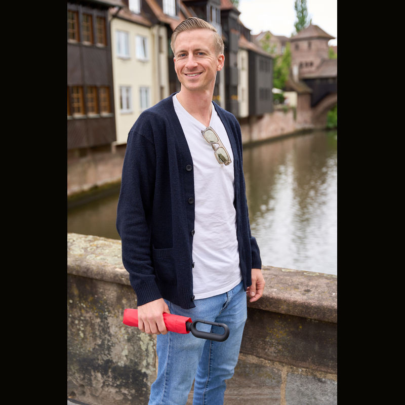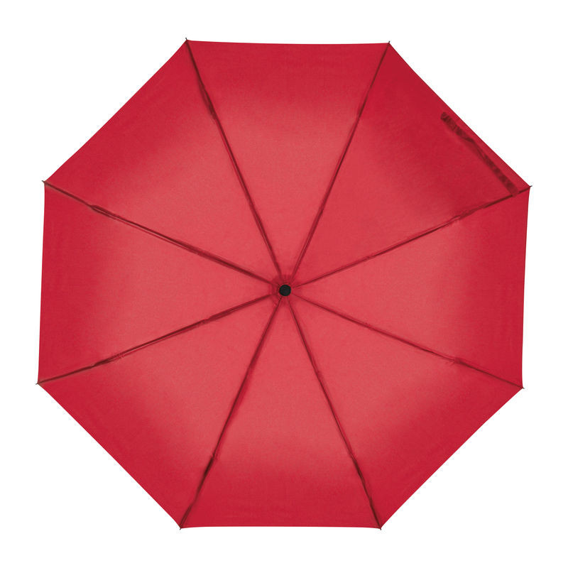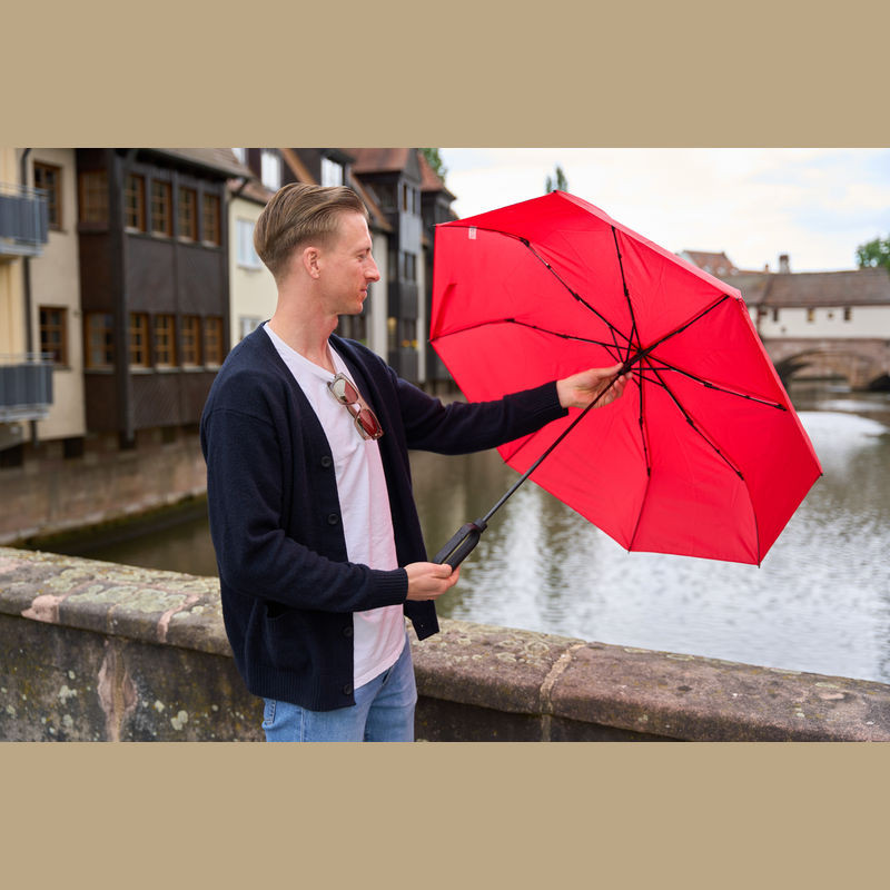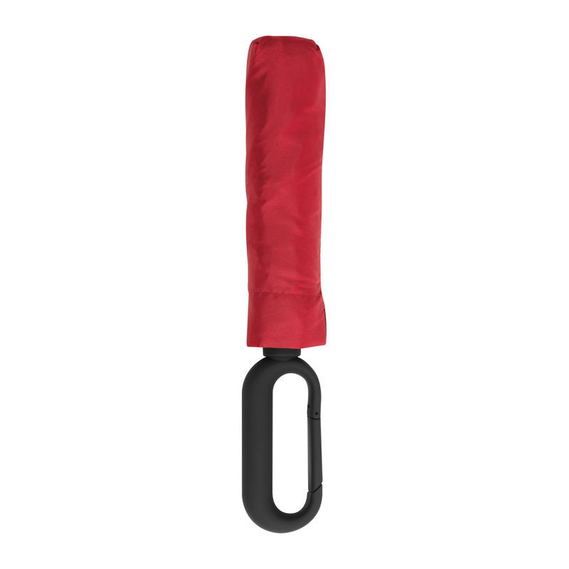 Praktikus összecsukható esernyő gumírozott karabiner markolattal. A termék nagy átmérője kényelmes búvóhelyet kínál az eső elől!