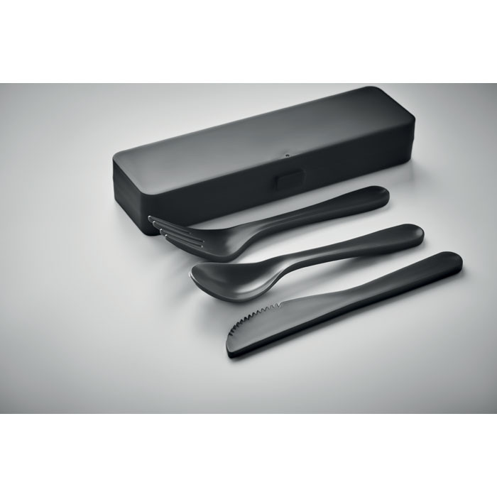 Többször használható PP hordozható evőeszközkészlet tokban. Kanalat, villát és kést tartalmaz.