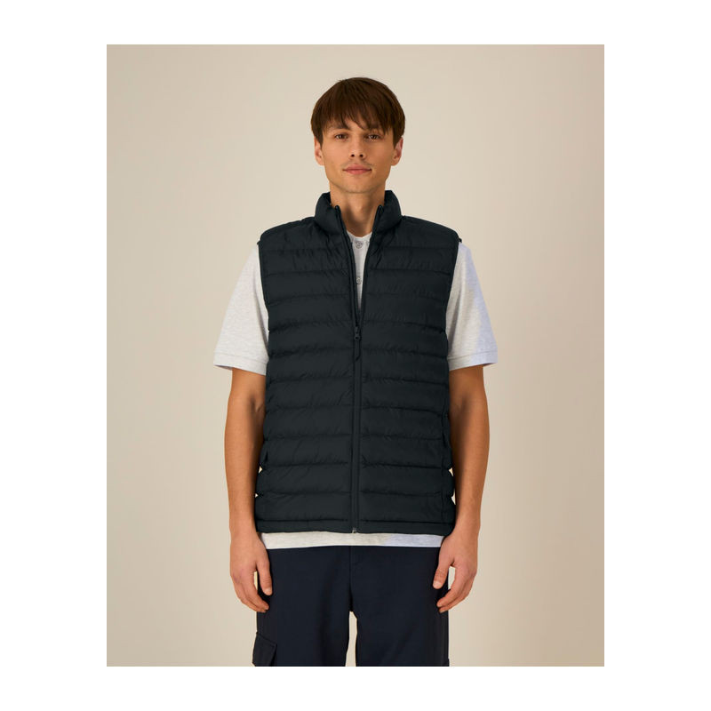 Ujjatlan kialakítás. Magas gallér. Fordított nejlon cipzár elöl, középen. Cipzáras zsebek díszszalaggal ellátott húzóval. Rugalmas szegőszalag a karkivágásnál. Teljesen steppelt kivitel. Oldalpanelek a jobb illeszkedésért. A belső varratok szegéllyel eldolgozva. Az alsó szegély állítható műanyag záróval és rugalmas zsinórral.