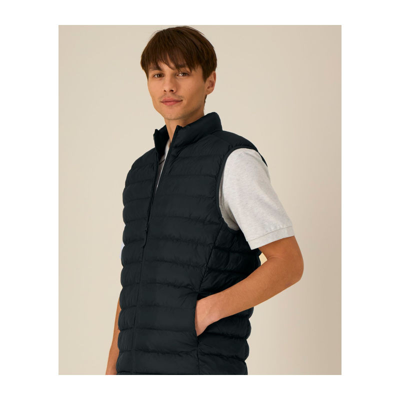 Ujjatlan kialakítás. Magas gallér. Fordított nejlon cipzár elöl, középen. Cipzáras zsebek díszszalaggal ellátott húzóval. Rugalmas szegőszalag a karkivágásnál. Teljesen steppelt kivitel. Oldalpanelek a jobb illeszkedésért. A belső varratok szegéllyel eldolgozva. Az alsó szegély állítható műanyag záróval és rugalmas zsinórral.