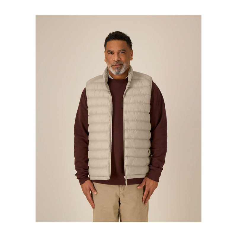 Ujjatlan kialakítás. Magas gallér. Fordított nejlon cipzár elöl, középen. Cipzáras zsebek díszszalaggal ellátott húzóval. Rugalmas szegőszalag a karkivágásnál. Teljesen steppelt kivitel. Oldalpanelek a jobb illeszkedésért. A belső varratok szegéllyel eldolgozva. Az alsó szegély állítható műanyag záróval és rugalmas zsinórral.