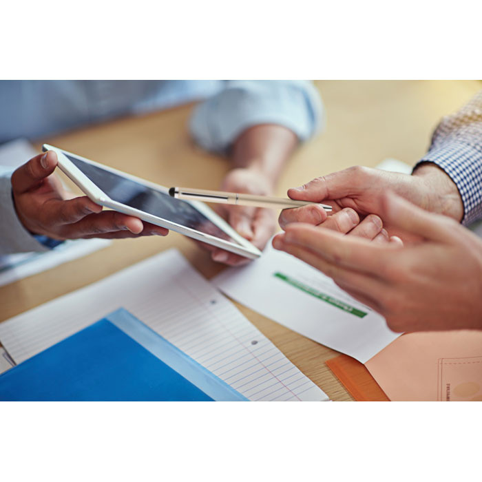 Újrahasznosított alumínium csavarmechanikás golyóstoll fényes króm csíptetővel és puha érintőhegy véggel. Kéken író betéttel.