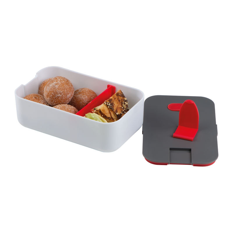 Műanyag, 1000 ml-es uzsonnás- vagy ételhordó doboz, szilikon gőzszeleppel, kivehető elválasztóval és az új generáció számára integrált mobiltelefon tartóval. Mikrózható és mosógatógépben mosható.