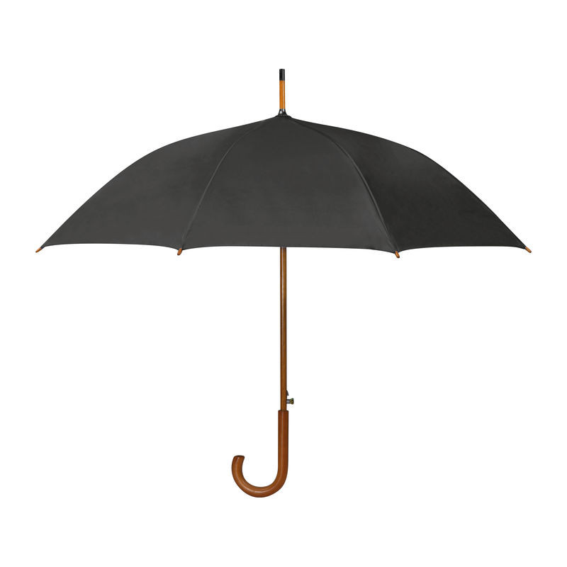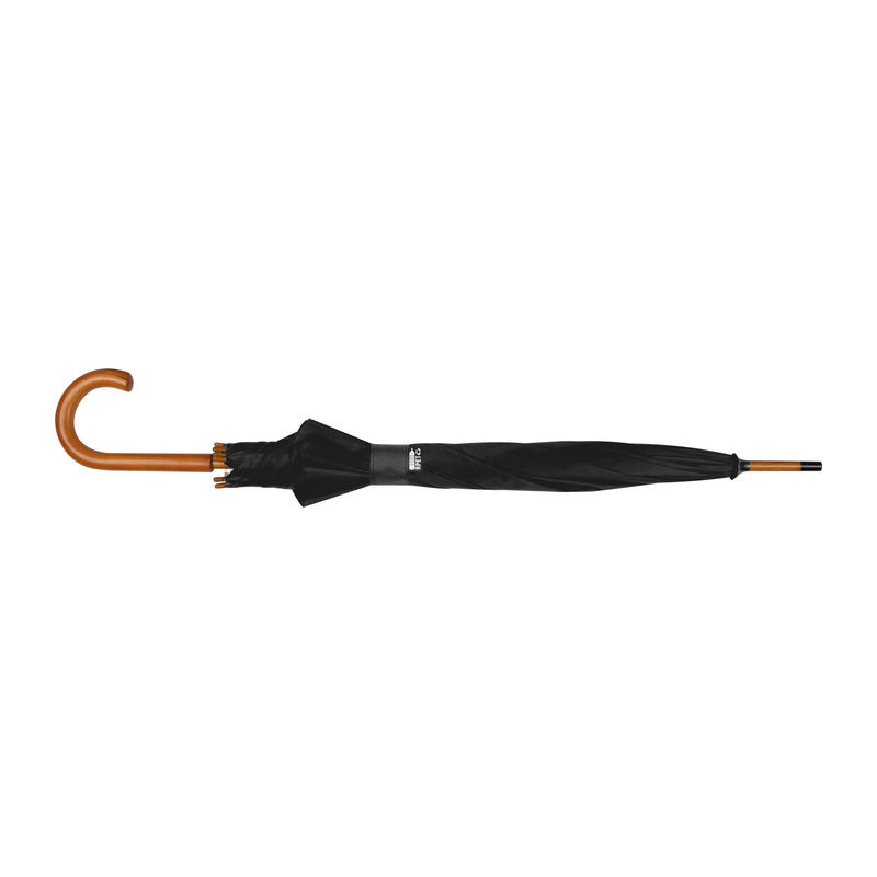 Kiváló minőségű automata esernyő, RPET újrahasznosított anyagból, üvegszálas szerkezettel, fa nyéllel és ívelt markolattal.