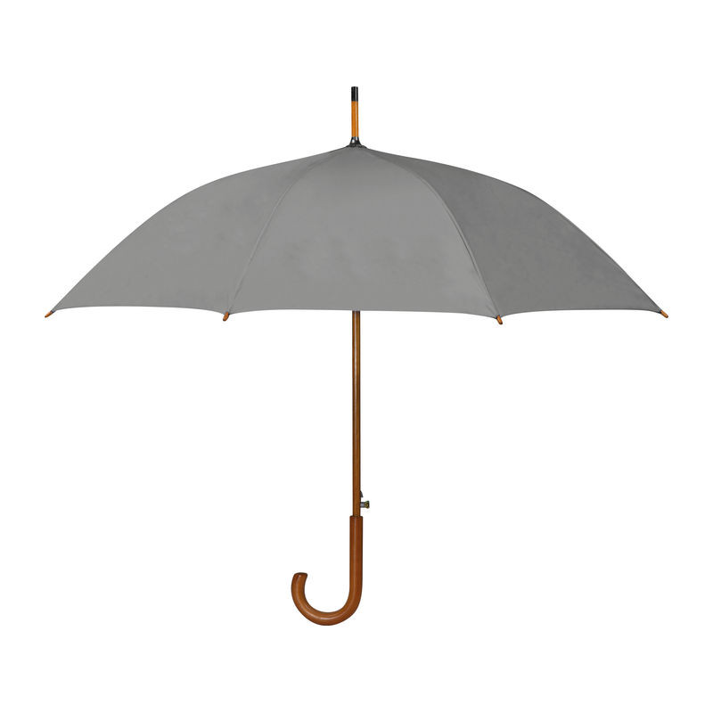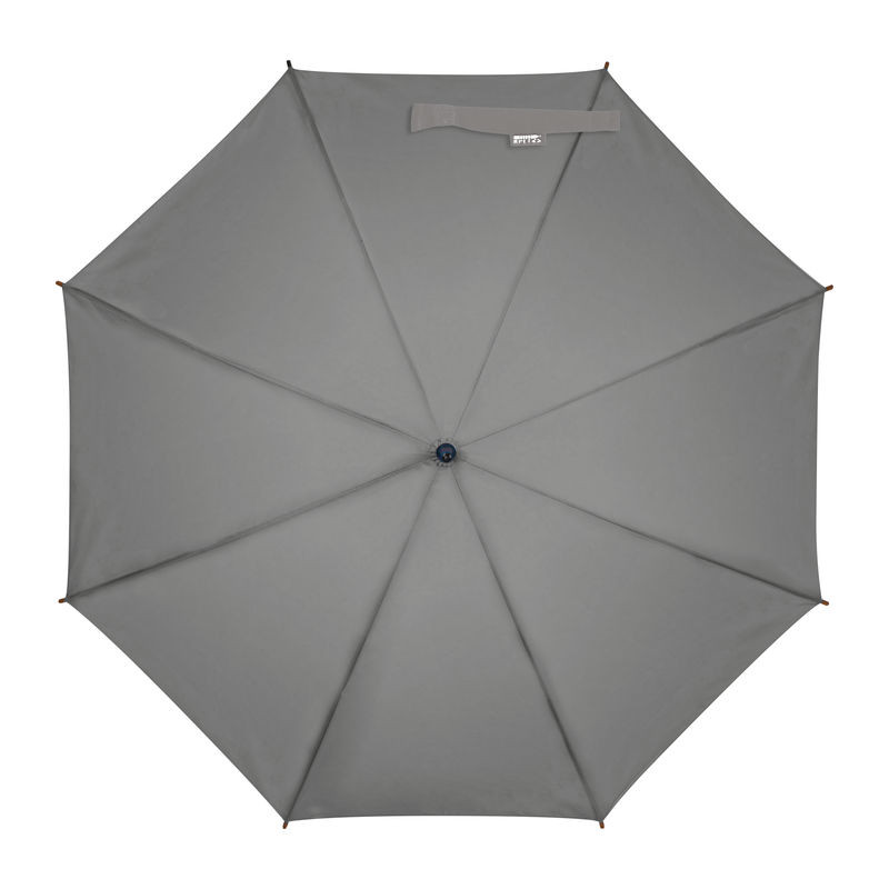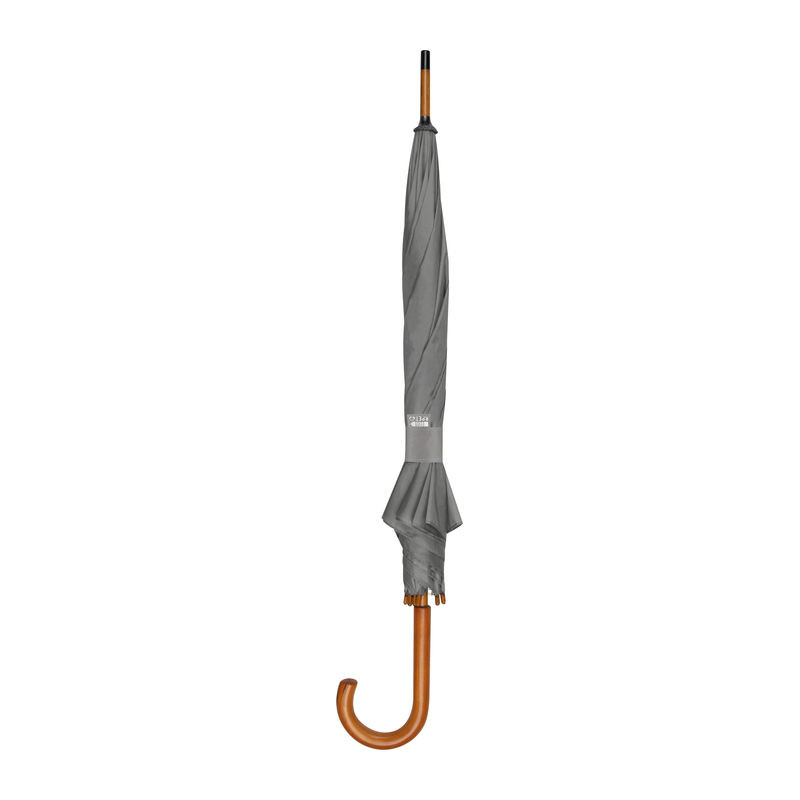 Kiváló minőségű automata esernyő, RPET újrahasznosított anyagból, üvegszálas szerkezettel, fa nyéllel és ívelt markolattal.