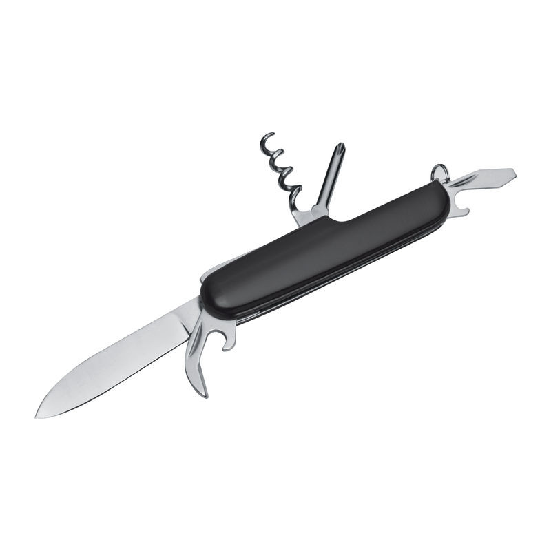 Rozsdamentes acélból készült 7 részes zsebkés amely tartalmaz üvegnyitót, bornyitót, csillag és laposfejű csavarhúzót, kulcstartót.