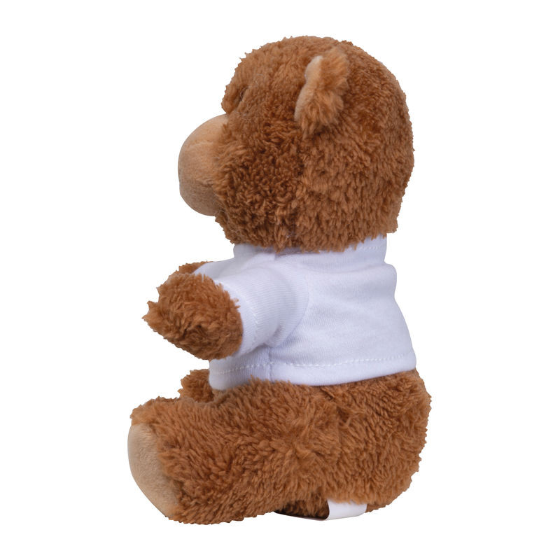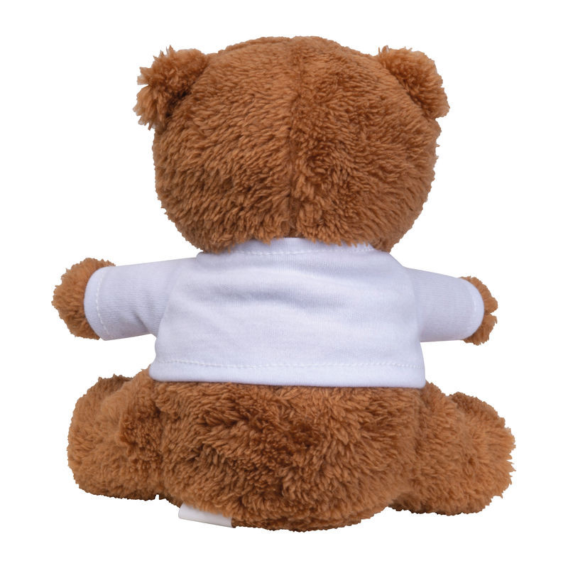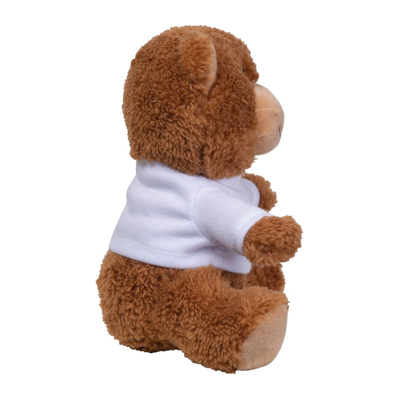 Kis méretű plüss maci poliészterből, fehér, újrahasznosított poliészterből készült pólóban.