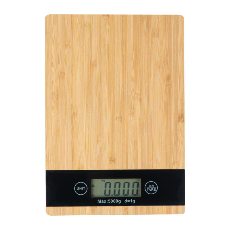 Digitális bambusz konyhai mérleg fekete kijelzővel. A maximális terhelhetőség 5 kg. Grammos pontoságot jelez. Mértékegységek : kg/g/oz/ml-ben jelennek meg.