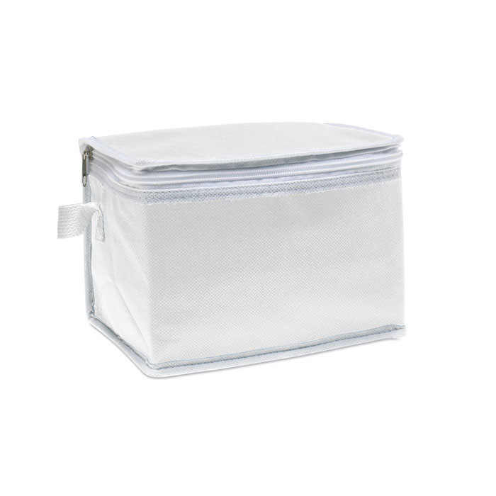 80 g vastag nemszőtt anyagból készült, belül alumínium fóliával, kívül fehér szegéllyel ellátott hűtőtáska 6 db üdítős doboz tárolására. Szigetelő anyag: alumínium fóliával laminált hab. Űrtartalom 3 l.
