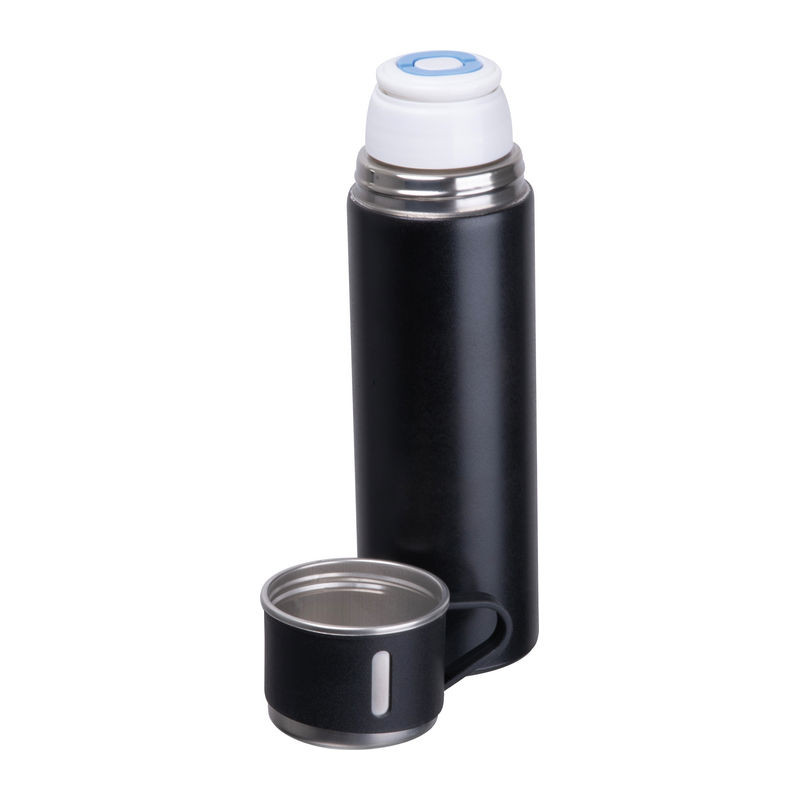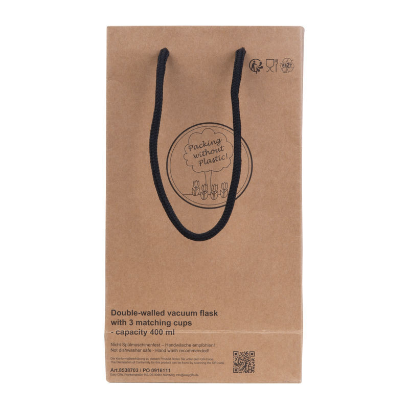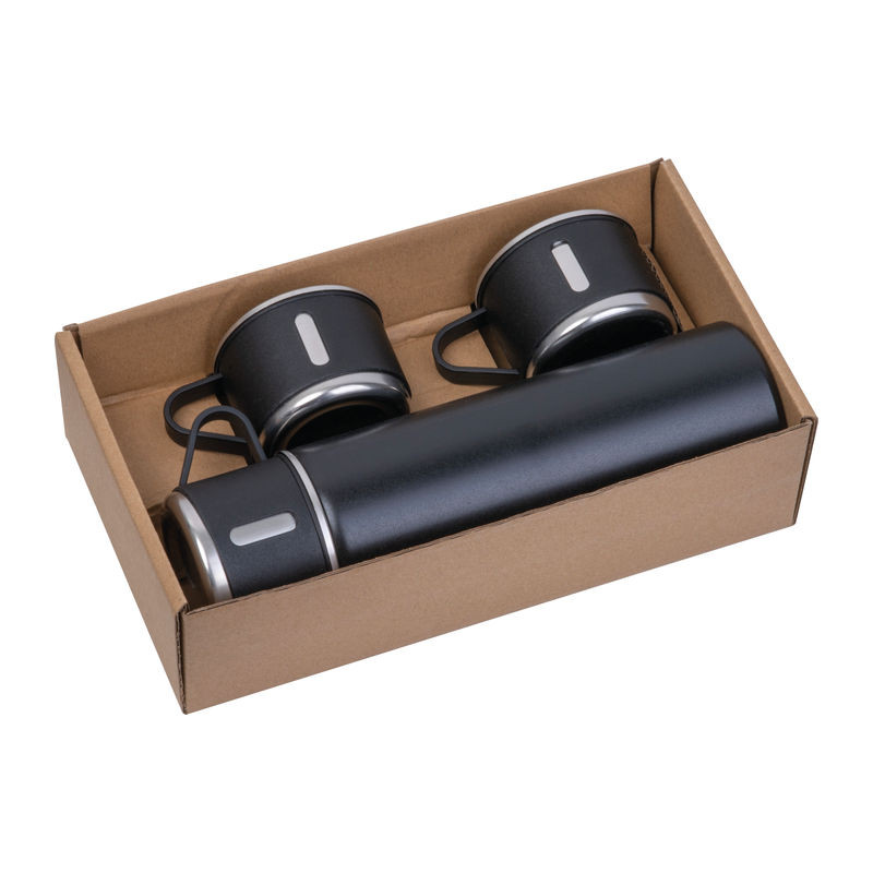 Hőtartó ivópalack szett, amely egy duplafalú, rozsdamentes acélból készült, 400 ml-es hőtartó thermo palackot tartalmaz gyorszáras kupakkal, valamint három, 120 ml-es rozsdamentes acélból készült bögrét műanyag bevonattal. Egyesével dobozba csomagolva szállítjuk.