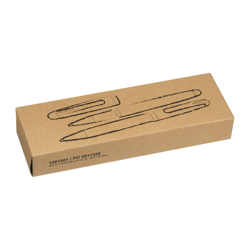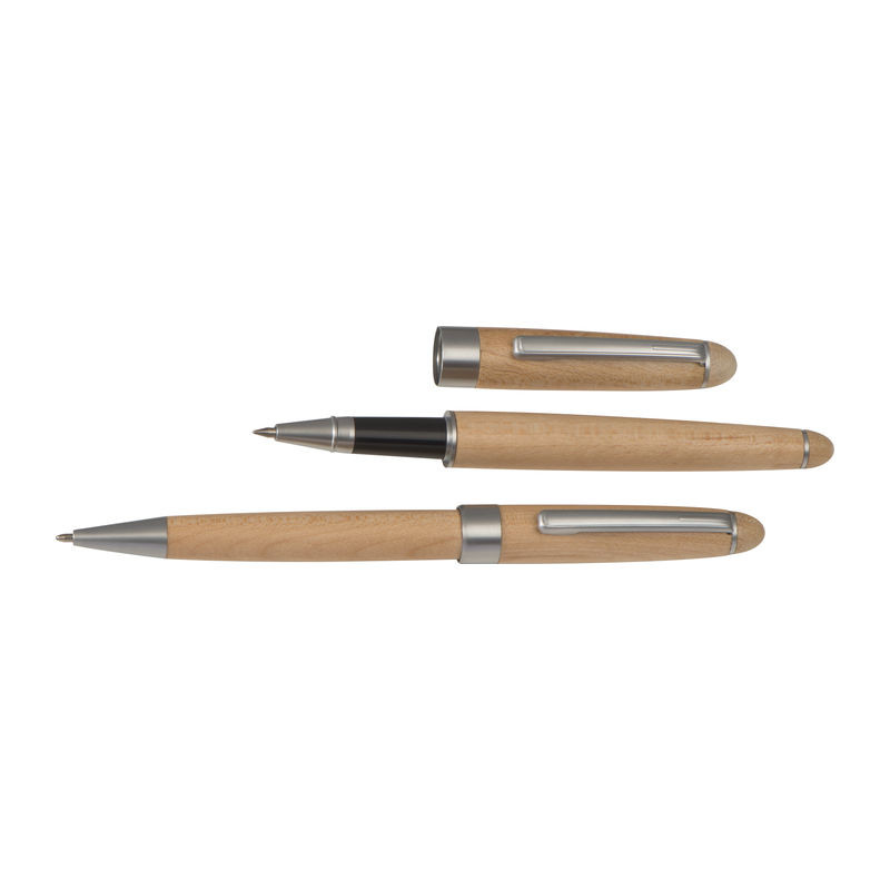 Fa tollkészlet, amely egy kék golyóstollból és egy kék roller toll-ból áll, fa tokban.