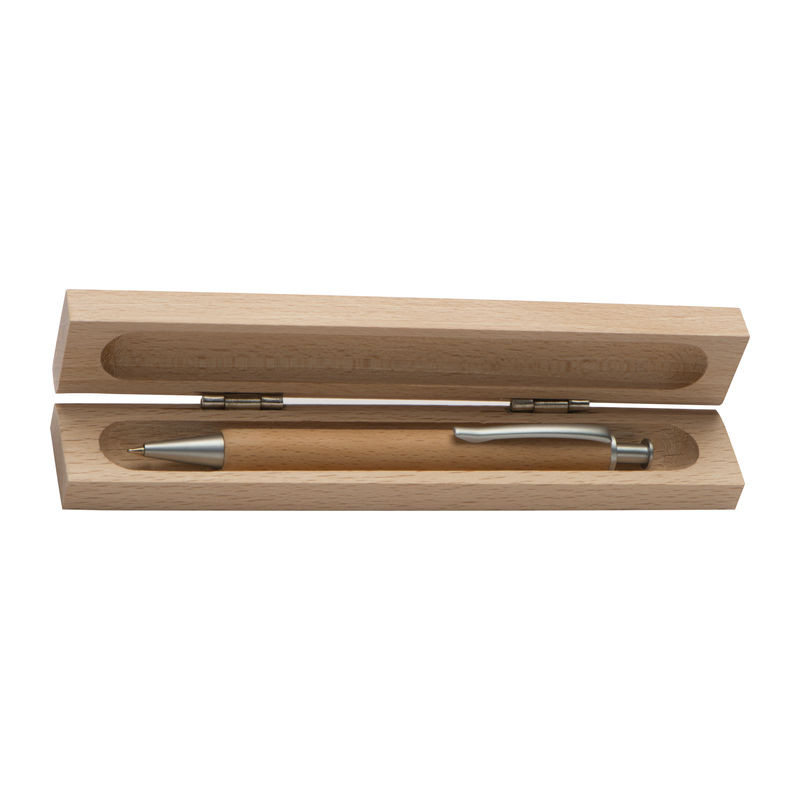 Fából és fém kiegészítökből készült golyóstoll, kéken író műanyag tollbetéttel, fa díszdobozban.