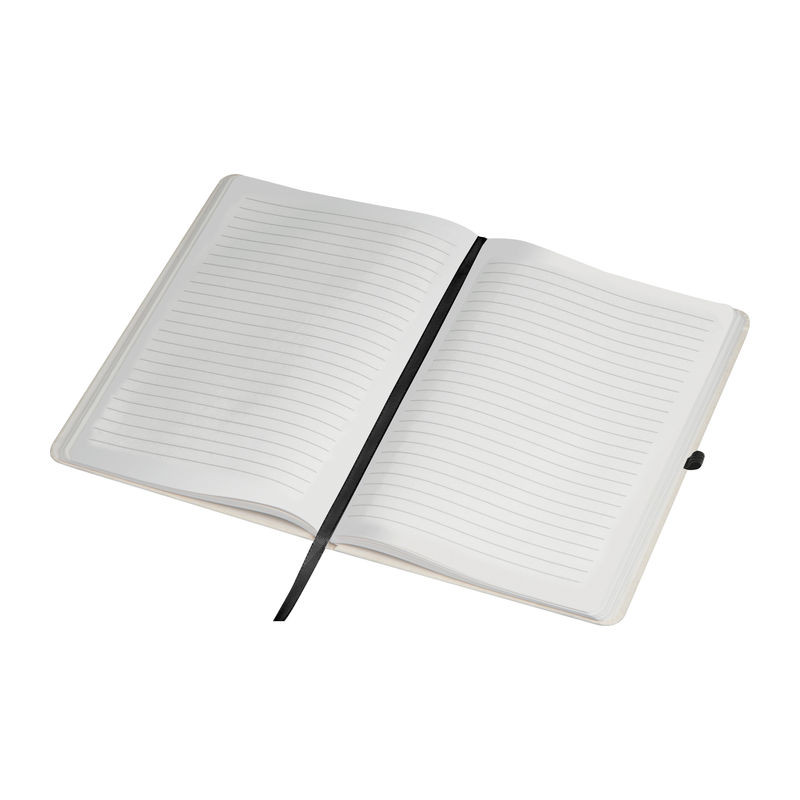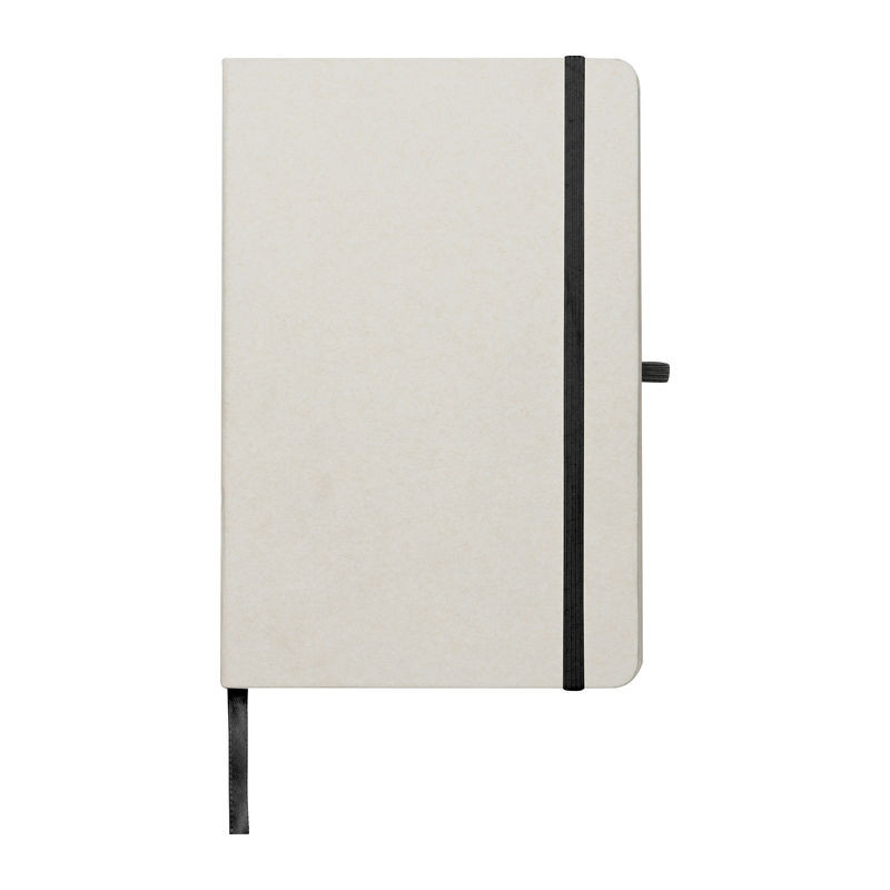 Újrahasznosított tejesdobozból készült, A5-ös méretű jegyzettömb. 160 db vonalas oldallal, fekete tolltartó hurokkal és gumis pánttal.