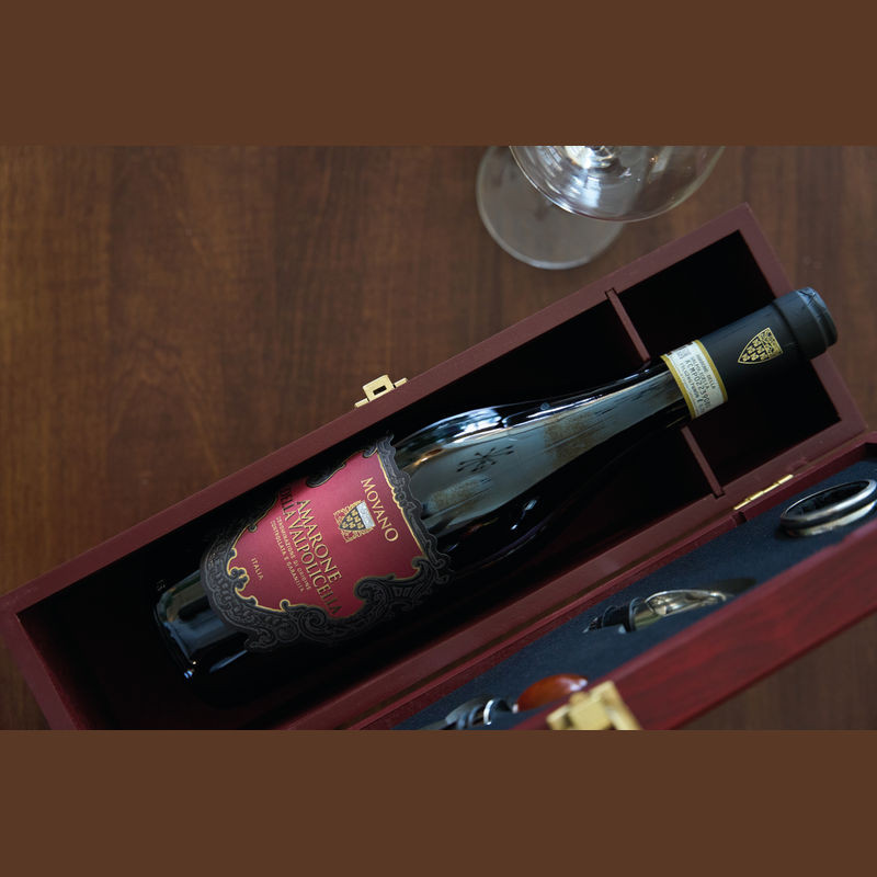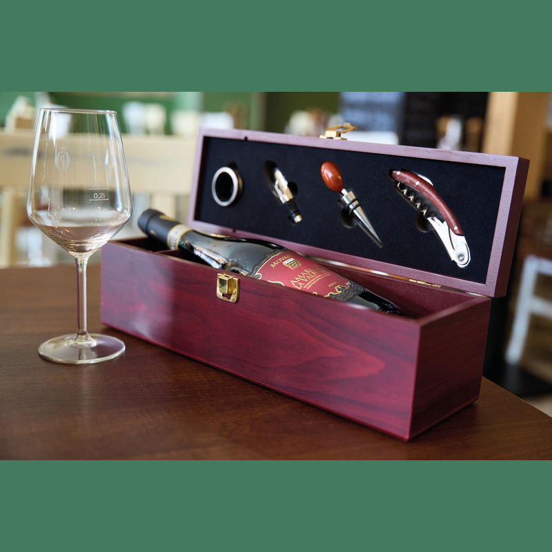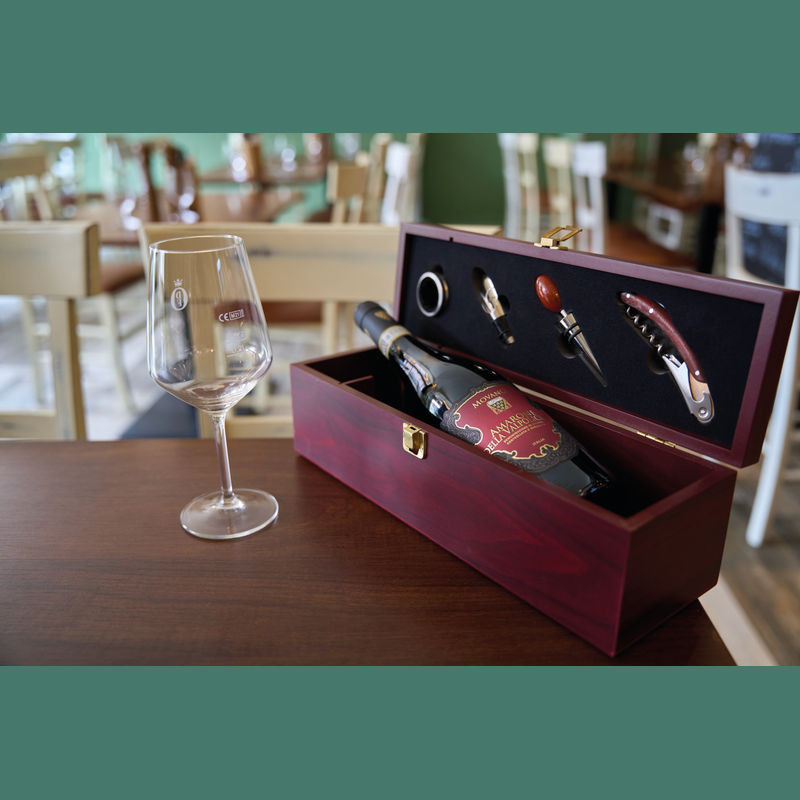 Finom kidolgozású boros-szett, amely tartalmazza a bor kinyitásához és fogyasztásához szükséges kiegészítőket is. A szett nem tartalmazza a bort.