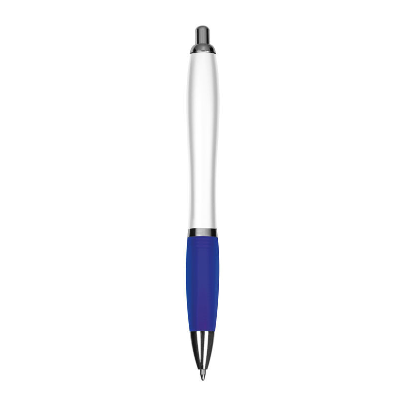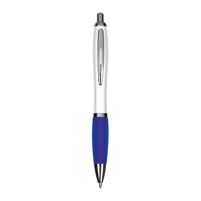 Kéken író műanyag golyóstoll, fehér tolltesttel, fém klipszel és különbőző színű gumi fogórésszel.