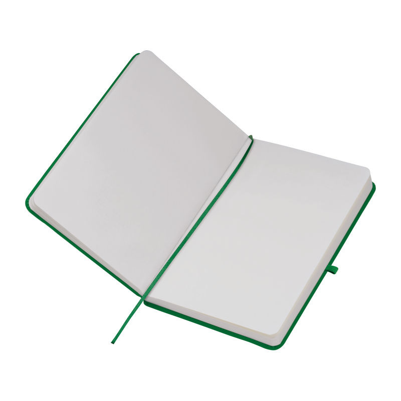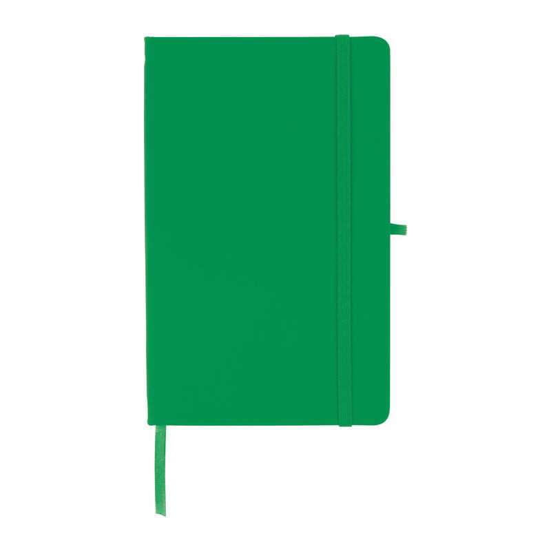 A5 méretű jegyzettömb puha PU borítással, 160 sima fehér oldallal. Színes gumis pánttal, könyvjelző szalaggal és praktikus tolltartó hurokkal ellátva.