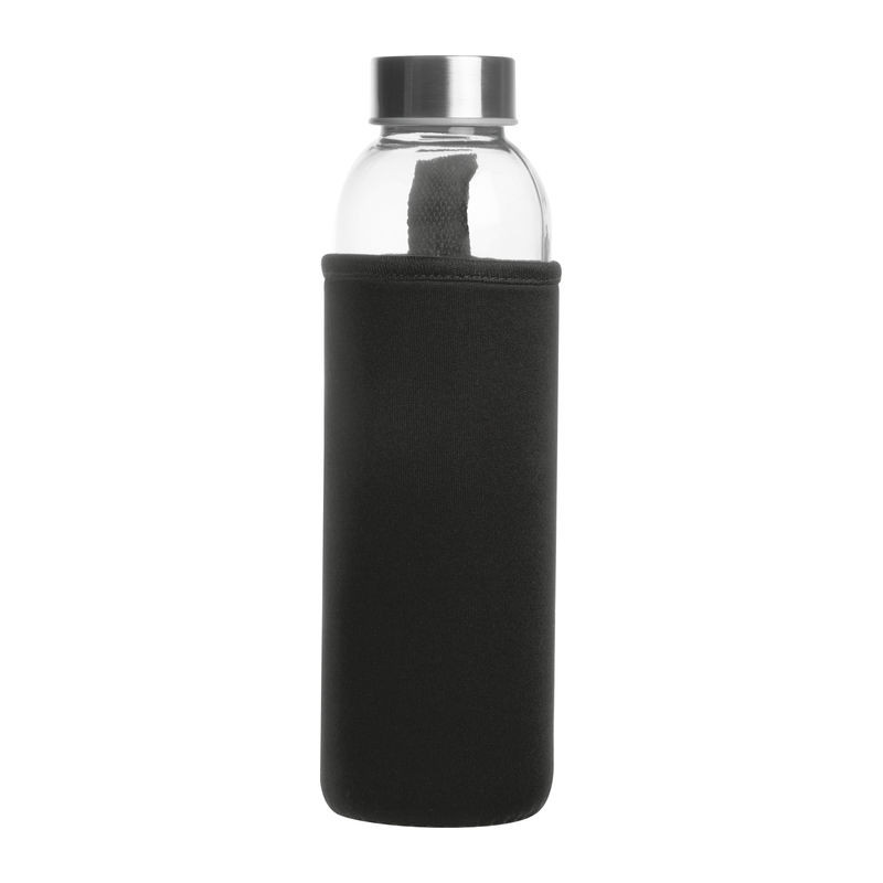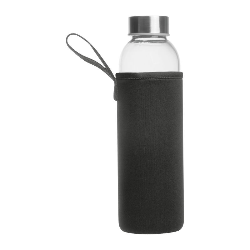 Üveg kulacs neoprén tokban hordozópánttal és szivárgásmentes fém kupakkal. Űrtartalom 500 ml.