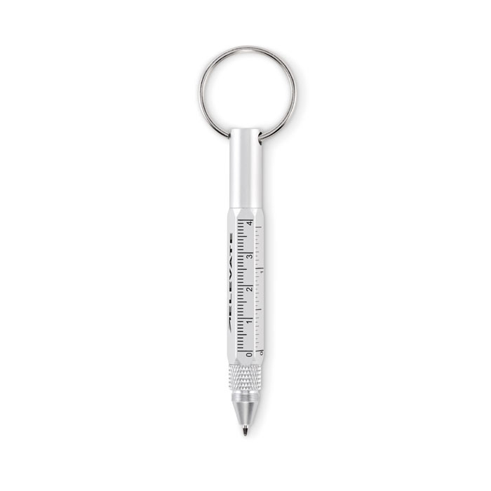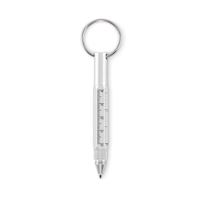 Kulcstartó csavarzáras golyóstollal újrahasznosított alumíniumból, 4 cm-es és 1 ,5 colos mini vonalzóval, érintőheggyel és 2 az 1-ben lapos- és csillag csavarhúzóval. Feketén író betéttel.